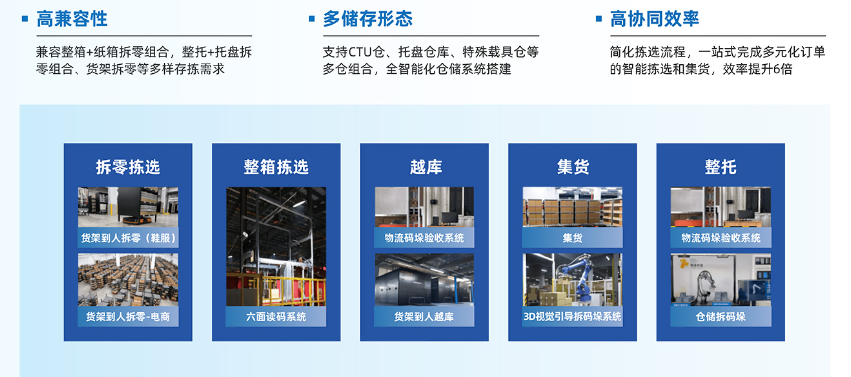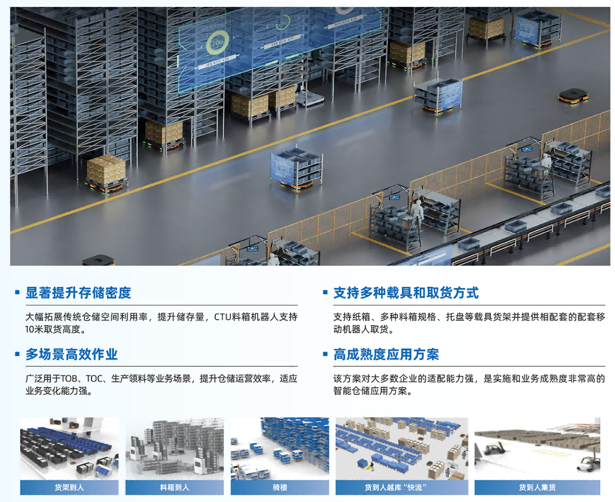 格方智能多形态混存拣选解决方案主要帮助用户实现大、中小件,轻重货物等多形态混存,料箱货架、托盘货架、特殊载具货架等多货架混存的仓库智能化拣选集货诉求;利用CTU料箱机器人、AMR潜伏机器人、FMR叉取机器人集群调度、接驳及分拣工作站等的协同作业满足日常仓储业务需求。